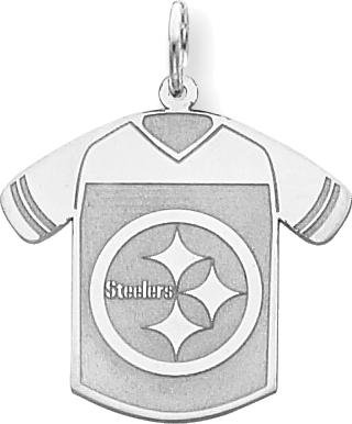 This is a beautiful new sterling silver Pittsburgh Steelers logo football jersey charm. It is a great gift for yourself or a loved one and makes the perfect addition to any jewelry collection. Notice: Michael Anthony Jewelers LLC is an "Official Licensee" of the National Football league for the manufacture and sale of precious metal jewelry bearing these trademarks. STYLE- NFL METAL- Sterling Silver ORIGIN- United States STAMPED- .925 SOLID/HOLLOW- Solid APPROXIMATE LENGTH- 32.2mm (1.27") APPROXIMATE WIDTH- 26.7mm (1.05") APPROXIMATE WEIGHT- 2 grams